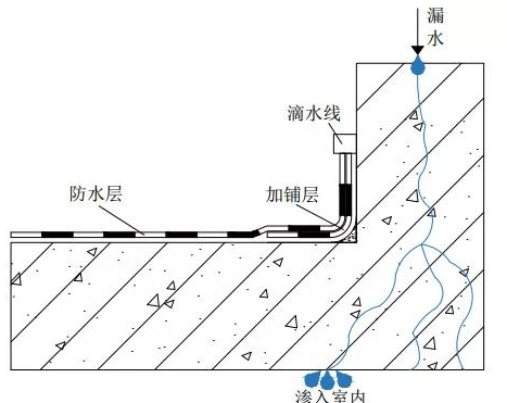 由于“女兒墻”存在開裂滲漏的風(fēng)險,以往的屋面防水收頭一般收至“女兒墻”的滴水線(如下圖),若“女兒墻”頂部開裂,水從裂縫滲入,就滲進(jìn)防水層反面,最終滲入室內(nèi)。