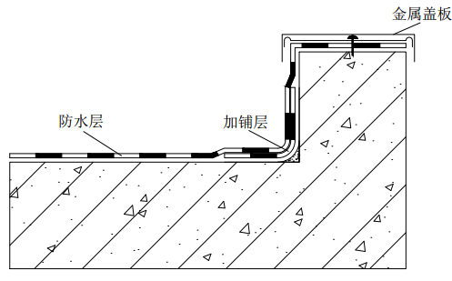 “女兒墻”防水的處理:應(yīng)取消“女兒墻”滴水線,屋面防水層應(yīng)施工至“女兒墻”頂部再安裝金屬蓋板作壓頂處理(如下圖)。