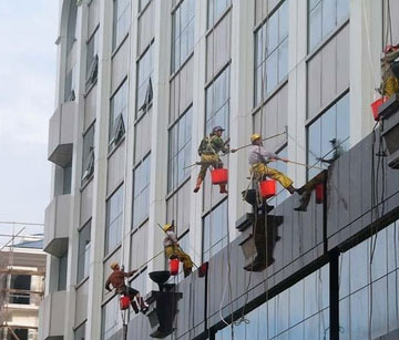 外墻清洗是高空清洗的一種,是一種非常危險(xiǎn)的保潔施工項(xiàng)目,外墻清洗不僅要做到清洗物的干凈整潔,更重要的是要確保高空清洗技術(shù)人員的人身安全。這就要求保潔公司的施工人員有著非常豐富的高空清洗操作經(jīng)驗(yàn),并有良好的管理團(tuán)隊(duì)和過(guò)硬的只我安全保護(hù)措施。本公司從這些方面著手首先解決了施工工具的安全性,采用雙保險(xiǎn)的跳板清洗方式,由專(zhuān)人負(fù)責(zé)現(xiàn)場(chǎng)施工,責(zé)任到人,嚴(yán)厲執(zhí)行施工安全要求,在上百次的外墻清洗施工中無(wú)任何安全事故。